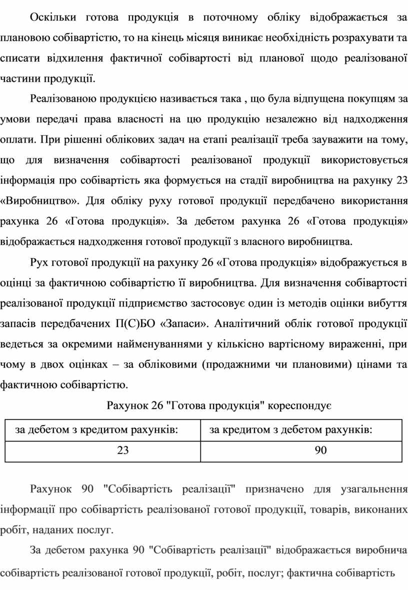 Реалізованою продукцією називається така , що була відпущена покупцям за умови передачі права власності на цю продукцію незалежно від надходження оплати. При рішенні облікових задач на етапі реалізації треба зауважити на тому, що для визначення собівартості реалізованої продукції використовується інформація про собівартість яка формується на стадії виробництва на рахунку 23 «Виробництво». Для обліку руху готової продукції передбачено використання рахунка 26 «Готова продукція». За дебетом рахунка 26 «Готова продукція» відображається надходження готової продукції з власного виробництва.