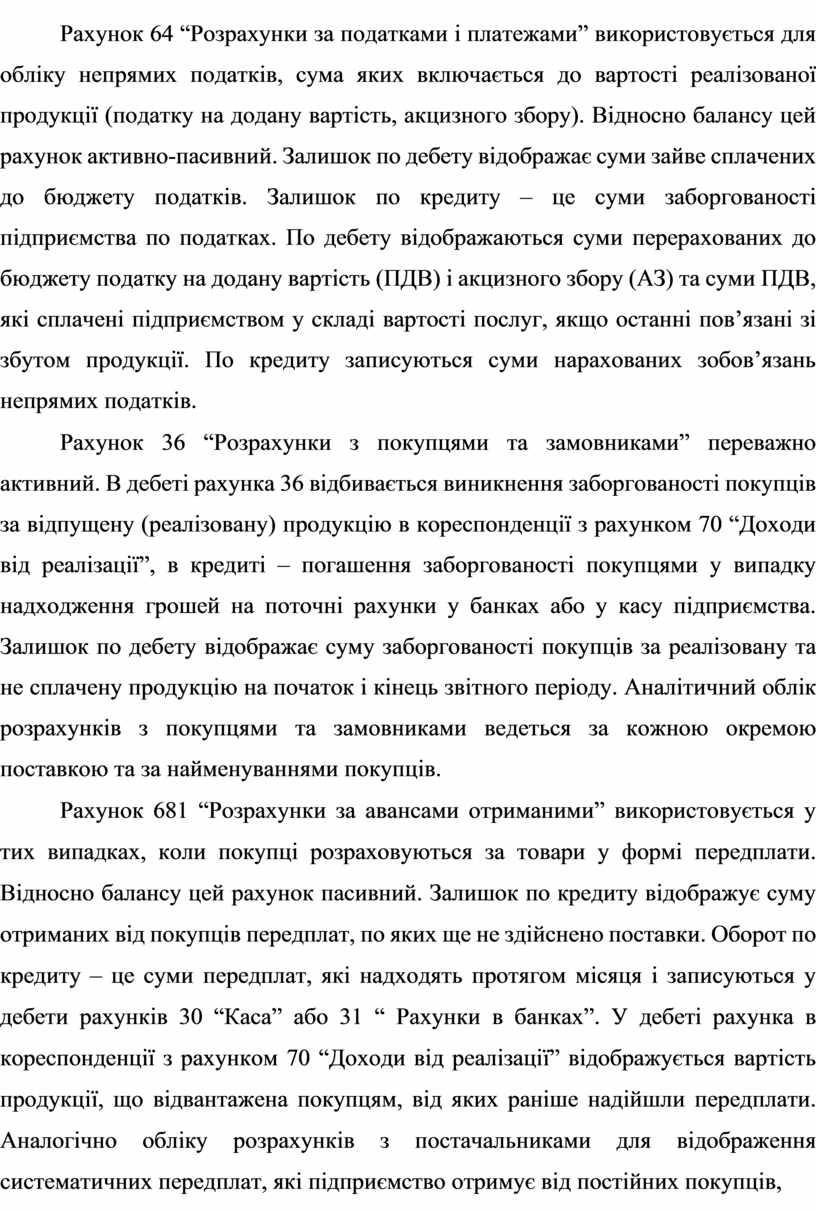 Рахунок 64 “Розрахунки за податками і платежами” використовується для обліку непрямих податків, сума яких включається до вартості реалізованої продукції (податку на додану вартість, акцизного збору). Відносно балансу цей рахунок активно-пасивний. Залишок по дебету відображає суми зайве сплачених до бюджету податків. Залишок по кредиту – це суми заборгованості підприємства по податках. По дебету відображаються суми перерахованих до бюджету податку на додану вартість (ПДВ) і акцизного збору (АЗ) та суми ПДВ, які сплачені підприємством у складі вартості послуг, якщо останні пов’язані зі збутом продукції. По кредиту записуються суми нарахованих зобов’язань непрямих податків.