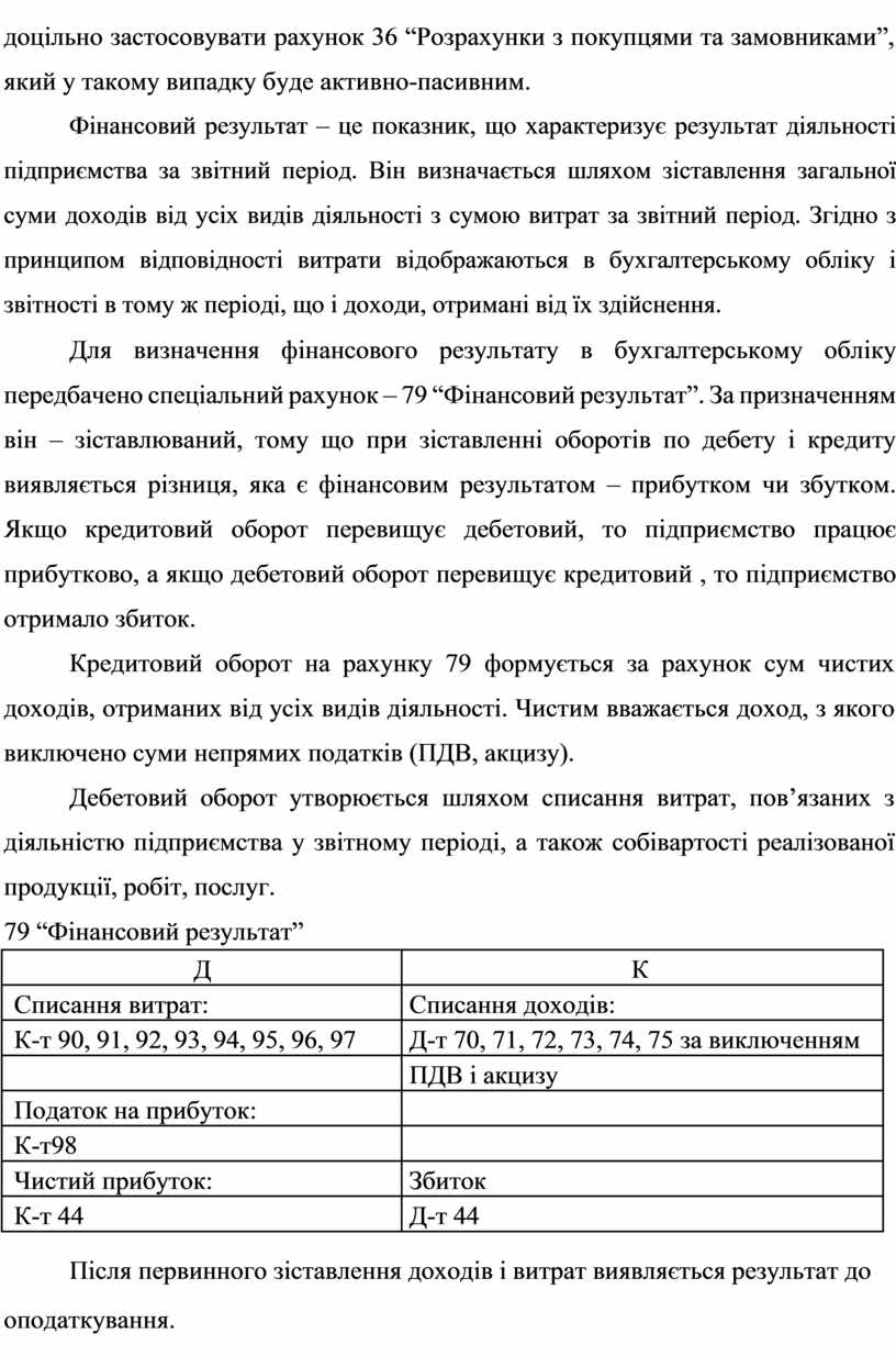 Для визначення фінансового результату в бухгалтерському обліку передбачено спеціальний рахунок – 79 “Фінансовий результат”. За призначенням він – зіставлюваний, тому що при зіставленні оборотів по дебету і кредиту виявляється різниця, яка є фінансовим результатом – прибутком чи збутком. Якщо кредитовий оборот перевищує дебетовий, то підприємство працює прибутково, а якщо дебетовий оборот перевищує кредитовий , то підприємство отримало збиток.