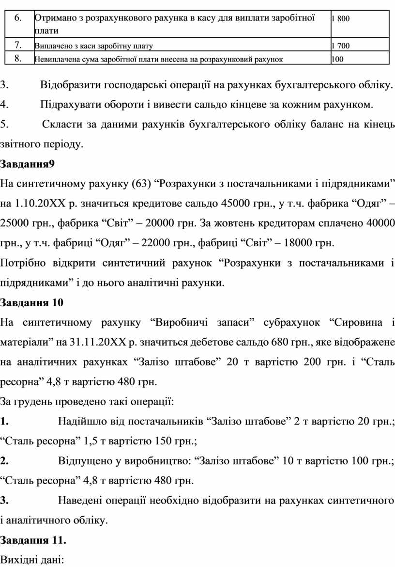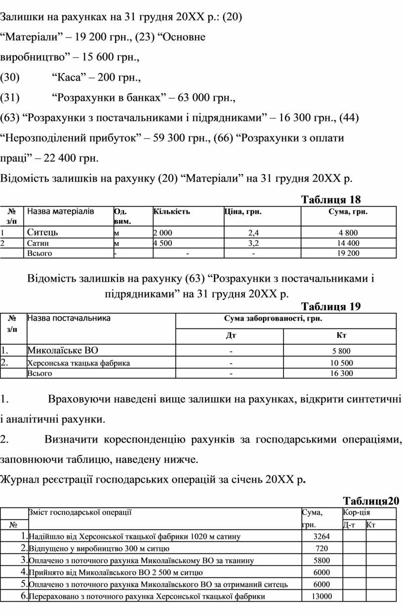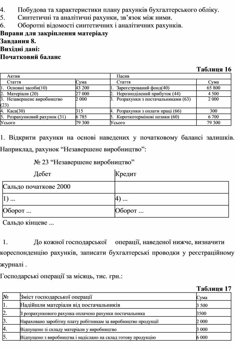 1. Враховуючи наведені вище залишки на рахунках, відкрити синтетичні