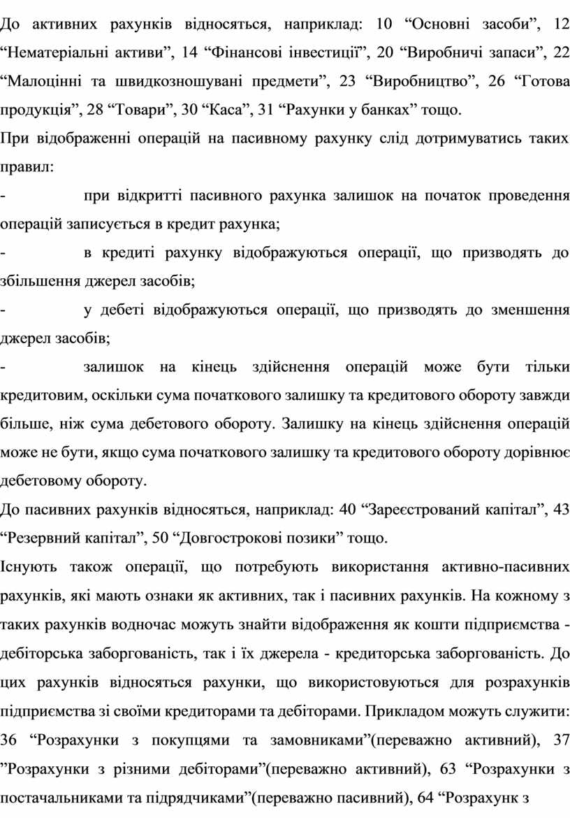 Існують також операції, що потребують використання активно-пасивних рахунків, які мають ознаки як активних, так і пасивних рахунків. На кожному з таких рахунків водночас можуть знайти відображення як кошти підприємства - дебіторська заборгованість, так і їх джерела - кредиторська заборгованість. До цих рахунків відносяться рахунки, що використовуються для розрахунків підприємства зі своїми кредиторами та дебіторами. Прикладом можуть служити: 36 “Розрахунки з покупцями та замовниками”(переважно активний), 37 ”Розрахунки з різними дебіторами”(переважно активний), 63 “Розрахунки з постачальниками та підрядчиками”(переважно пасивний), 64 “Розрахунк з