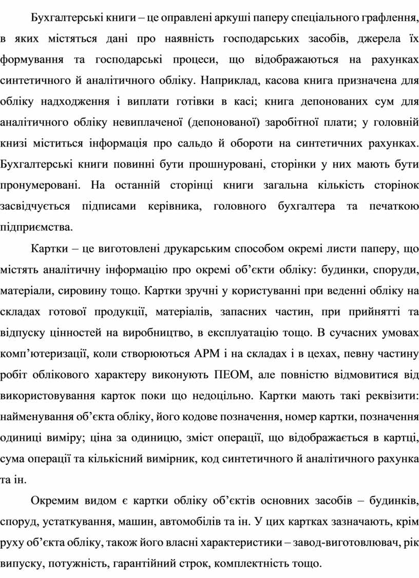 Картки – це виготовлені друкарським способом окремі листи паперу, що містять аналітичну інформацію про окремі об’єкти обліку: будинки, споруди, матеріали, сировину тощо. Картки зручні у користуванні при веденні обліку на складах готової продукції, матеріалів, запасних частин, при прийнятті та відпуску цінностей на виробництво, в експлуатацію тощо. В сучасних умовах комп’ютеризації, коли створюються АРМ і на складах і в цехах, певну частину робіт облікового характеру виконують ПЕОМ, але повністю відмовитися від використовування карток поки що недоцільно. Картки мають такі реквізити: найменування об’єкта обліку, його кодове позначення, номер картки, позначення одиниці виміру; ціна за одиницю, зміст операції, що відображається в картці, сума операції та кількісний вимірник, код синтетичного й аналітичного рахунка та ін.