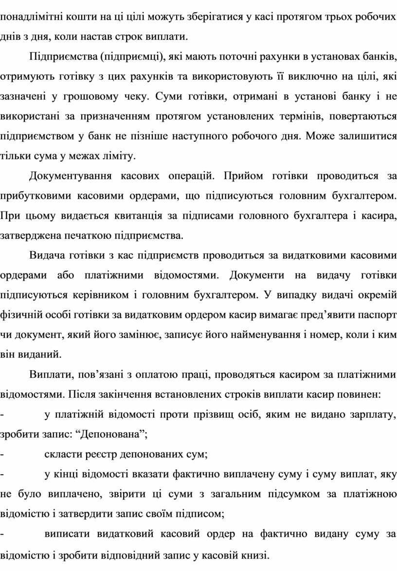 Установа банку, в якому підприємство відкрило поточний рахунок, встановлює ліміт залишку готівки у касі – граничний розмір готівки, який може залишатися у касі на кінець робочого дня. Всі кошти, понад установленого ліміту повинні здаватися у каси банків для зарахування на поточний рахунок.