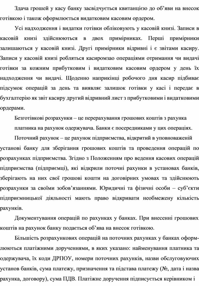 Більшість розрахункових операцій на поточних рахунках у банках оформ-люються платіжними дорученнями, в яких указано: найменування платника та одержувача, їх коди ДРПОУ, номери поточних рахунків, назви обслуговуючих установ банків, сума платежу, призначення та підстава платежу (№, дата і назва рахунка, договору), сума ПДВ. Платіжне доручення підписується керівником і