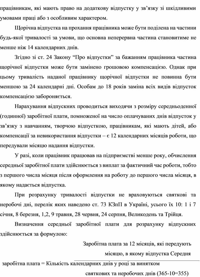 Законом України “Про відпустки” 504/96-ВР від 15.11.96 р. встановлено державні гарантії права на відпустки, визначено умови, тривалість і порядок надання їх працівникам для відновлення працездатності, зміцнення здоров’я, а також для виховання дітей, задоволення власних життєво важливих потреб та інтересів, усебічного розвитку особи.