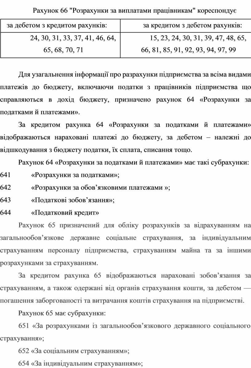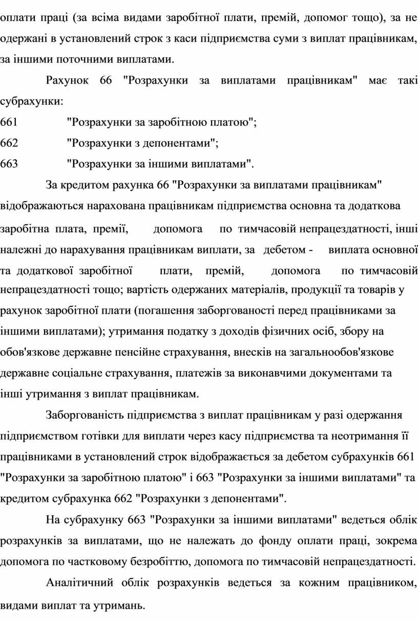 На рахунку 66 "Розрахунки за виплатами працівникам" ведеться узагальнення інформації про розрахунки за виплатами працівникам, які належать як до облікового, так і до необлікового складу підприємства, - з