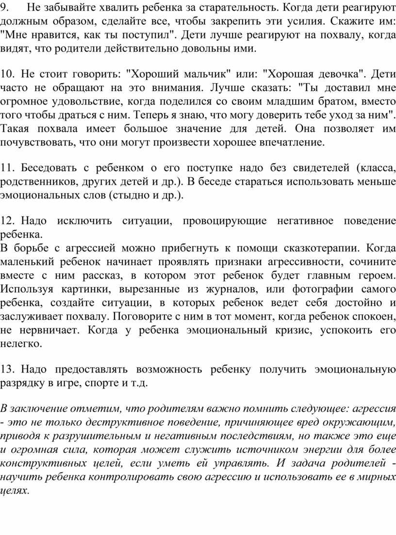 В заключение отметим, что родителям важно помнить следующее: агрессия - это не только деструктивное поведение, причиняющее вред окружающим, приводя к разрушительным и негативным последствиям, но также это еще и огромная сила, которая может служить источником энергии для более конструктивных целей, если уметь ей управлять. И задача родителей - научить ребенка контролировать свою агрессию и использовать ее в мирных целях.