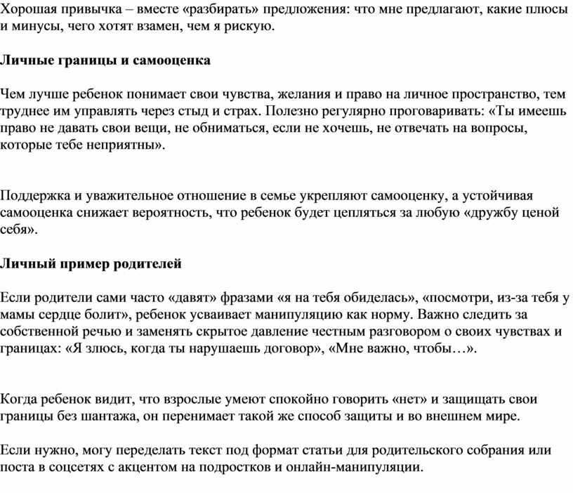Если нужно, могу переделать текст под формат статьи для родительского собрания или поста в соцсетях с акцентом на подростков и онлайн‑манипуляции.