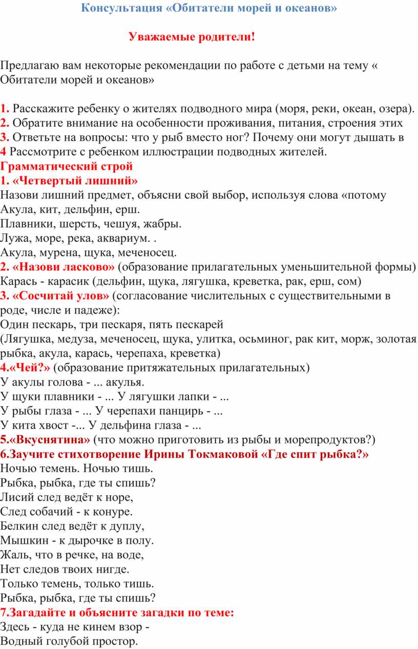6.Заучите стихотворение Ирины Токмаковой «Где спит рыбка?»
