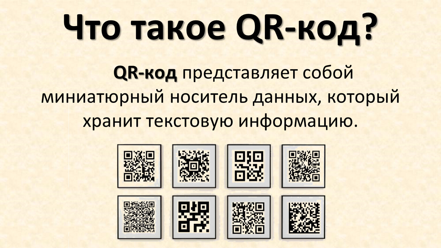 QR-код представляет собой миниатюрный носитель данных, который хранит текстовую информацию.