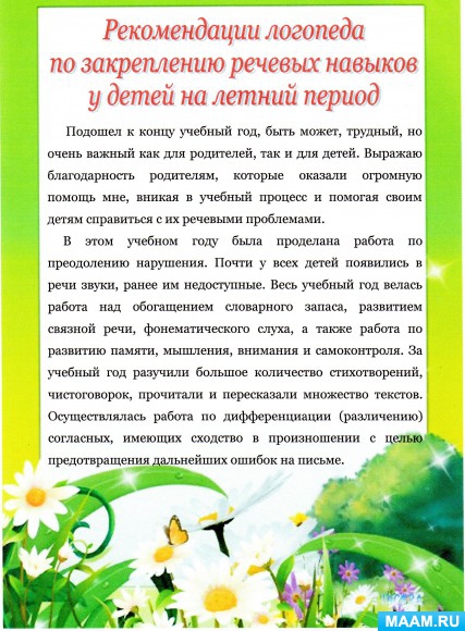 Рекомендации логопеда по закреплению речевых навыков у детей на летний период