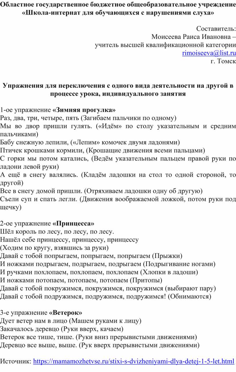 Упражнения для переключения с одного вида деятельности на другой в процессе урока, индивидуального занятия
