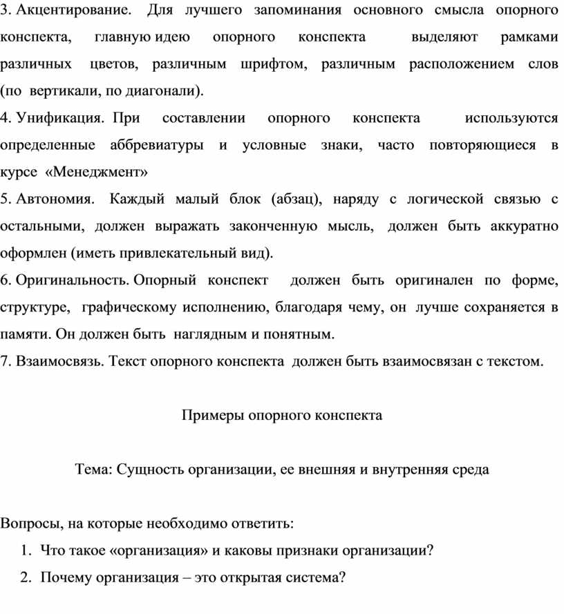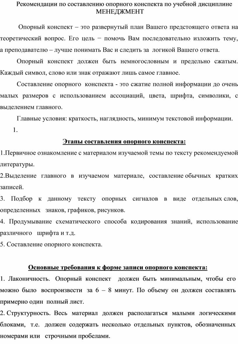 Рекомендации по составлению опорного конспекта по учебной дисциплине МЕНЕДЖМЕНТ