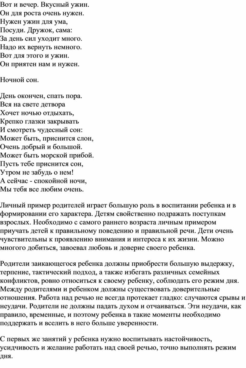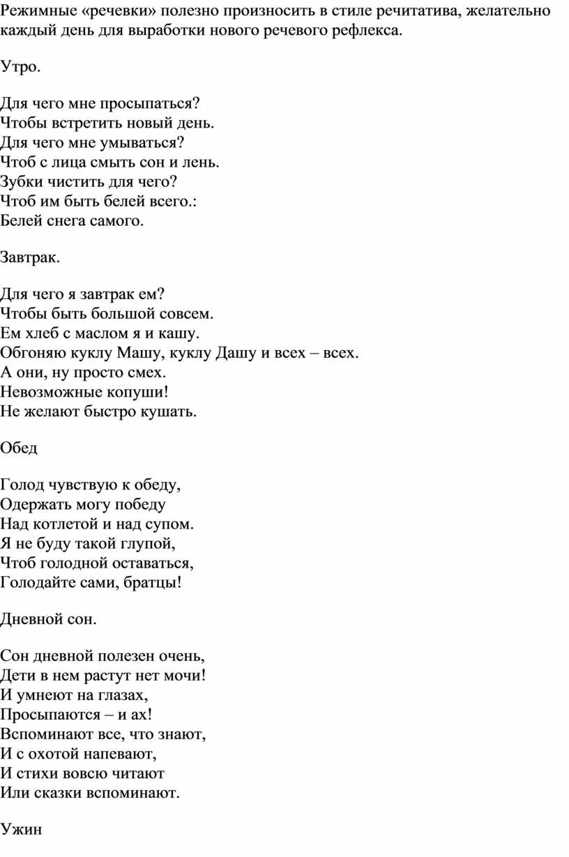 Режимные «речевки» полезно произносить в стиле речитатива, желательно каждый день для выработки нового речевого рефлекса.