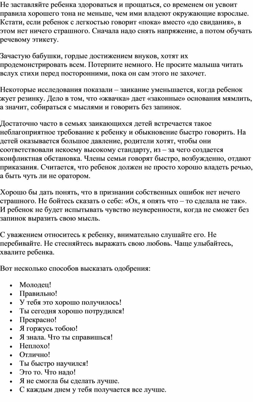 · не следует торопить при ответах, ибо только терпеливое внимание к речи ребенка может вызывать у него желание говорить, полезно похвалить стесняющегося своей речи ребенка;