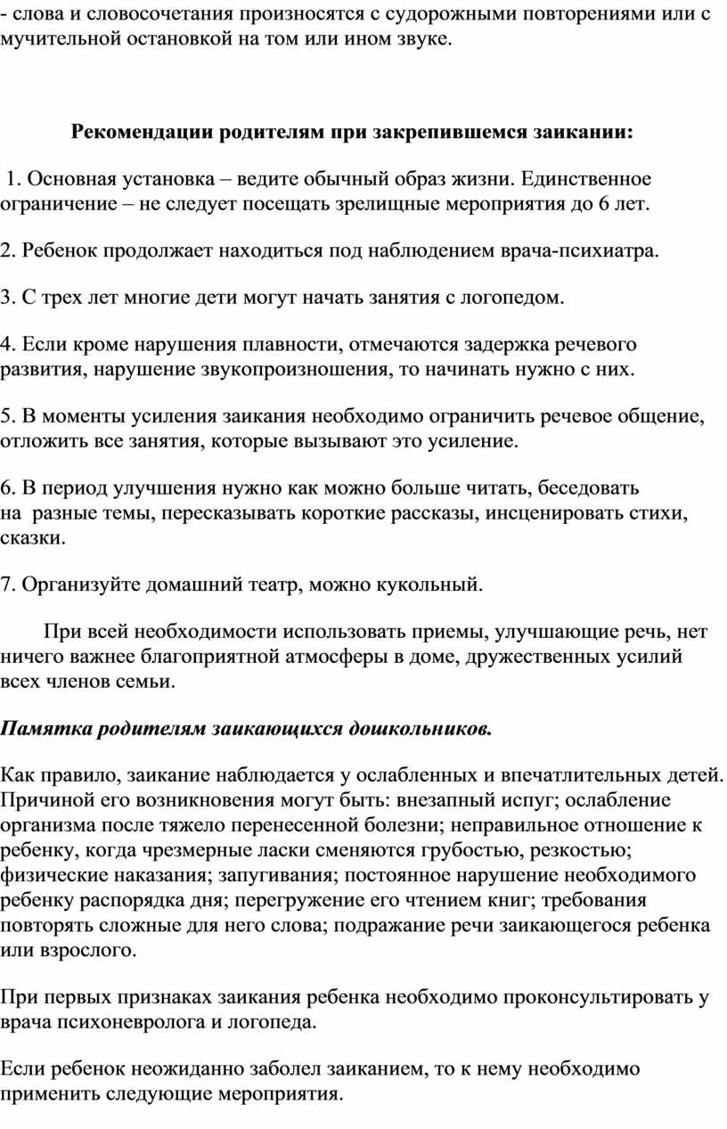 Родители заикающегося ребенка должны приобрести большую выдержку, терпение, тактический подход, а также избегать различных семейных конфликтов, ровно относиться к своему ребенку, соблюдать его режим дня. Между родителями и ребенком должны существовать доверительные отношения. Работа над речью не всегда протекает гладко: случаются срывы и неудачи. Родители не должны падать духом и отчаиваться. Эти неудачи, как правило, временные, и поэтому ребенка в такие моменты необходимо поддержать и вселить в него больше уверенности.