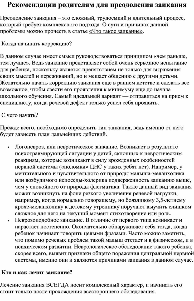Лечение заикания ВСЕГДА носит комплексный характер, и начинать его стоит только после прохождения всестороннего обследования.