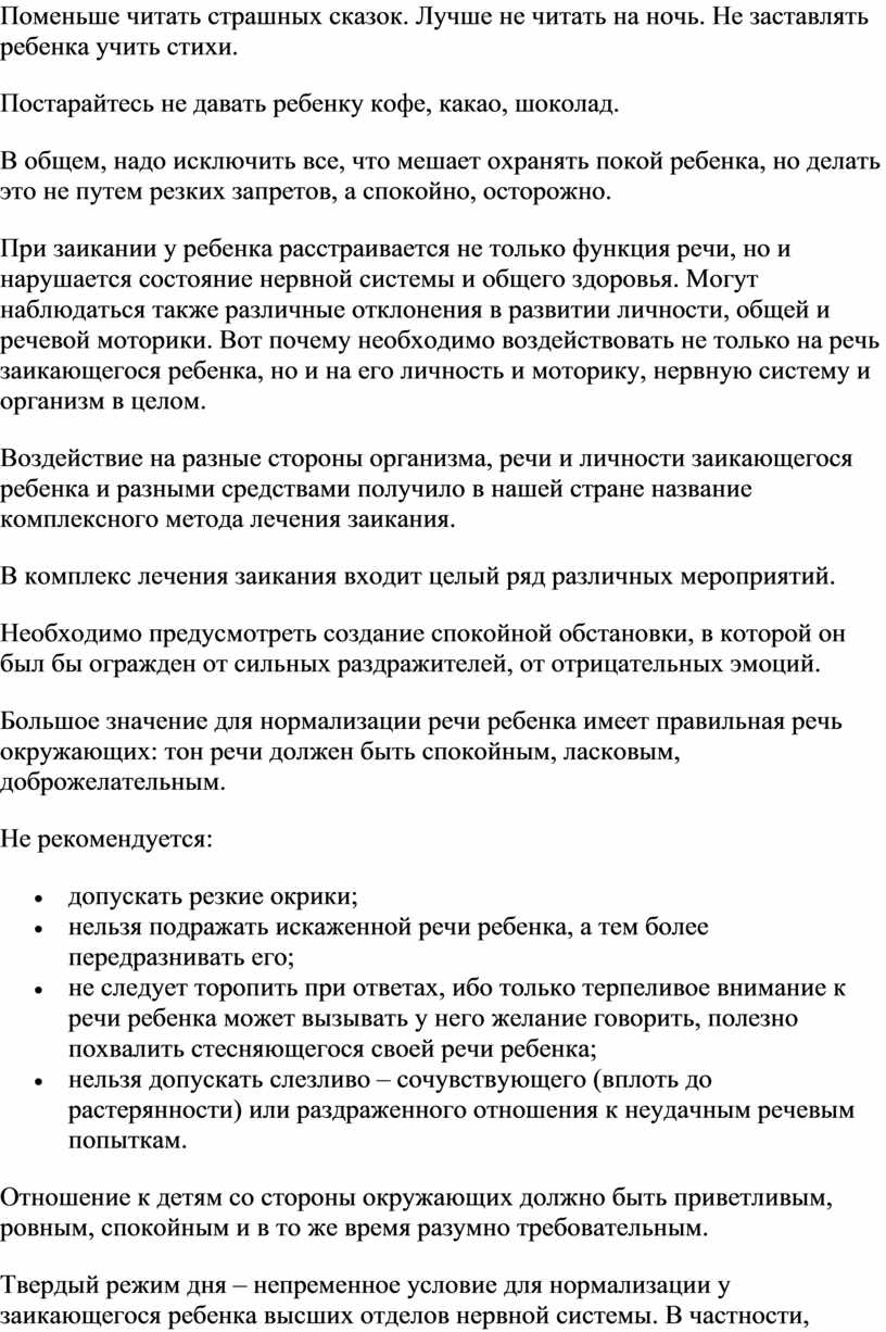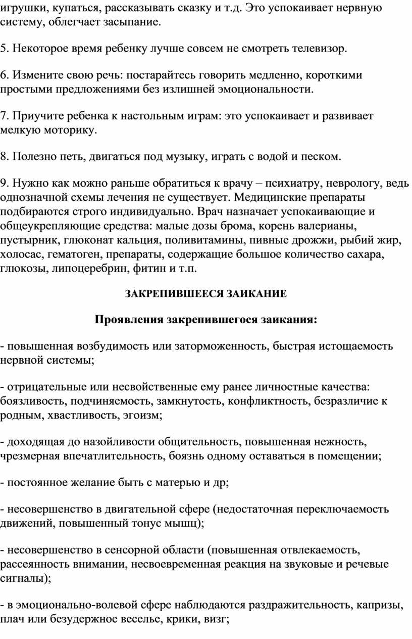При заикании у ребенка расстраивается не только функция речи, но и нарушается состояние нервной системы и общего здоровья. Могут наблюдаться также различные отклонения в развитии личности, общей и речевой моторики. Вот почему необходимо воздействовать не только на речь заикающегося ребенка, но и на его личность и моторику, нервную систему и организм в целом.