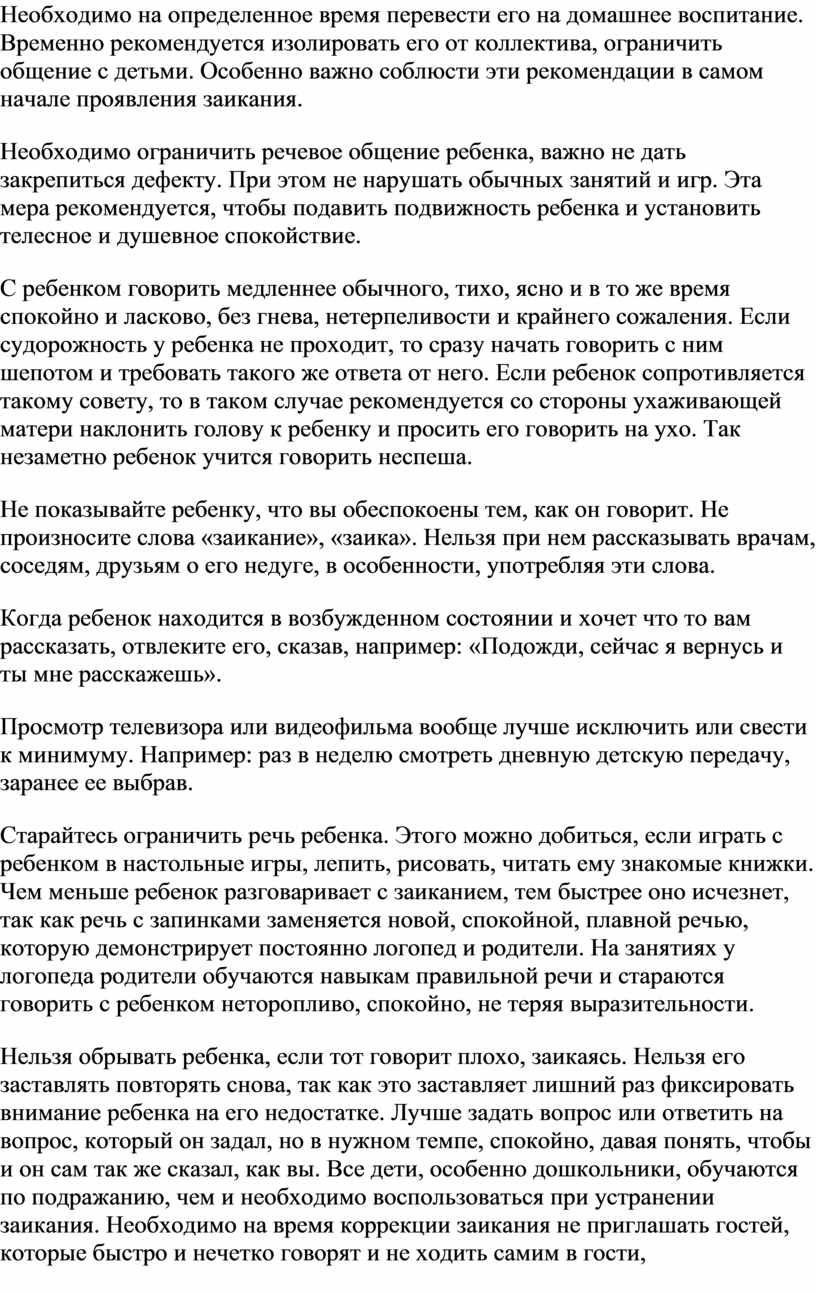 Необходимо на определенное время перевести его на домашнее воспитание. Временно рекомендуется изолировать его от коллектива, ограничить общение с детьми. Особенно важно соблюсти эти рекомендации в самом начале проявления заикания.