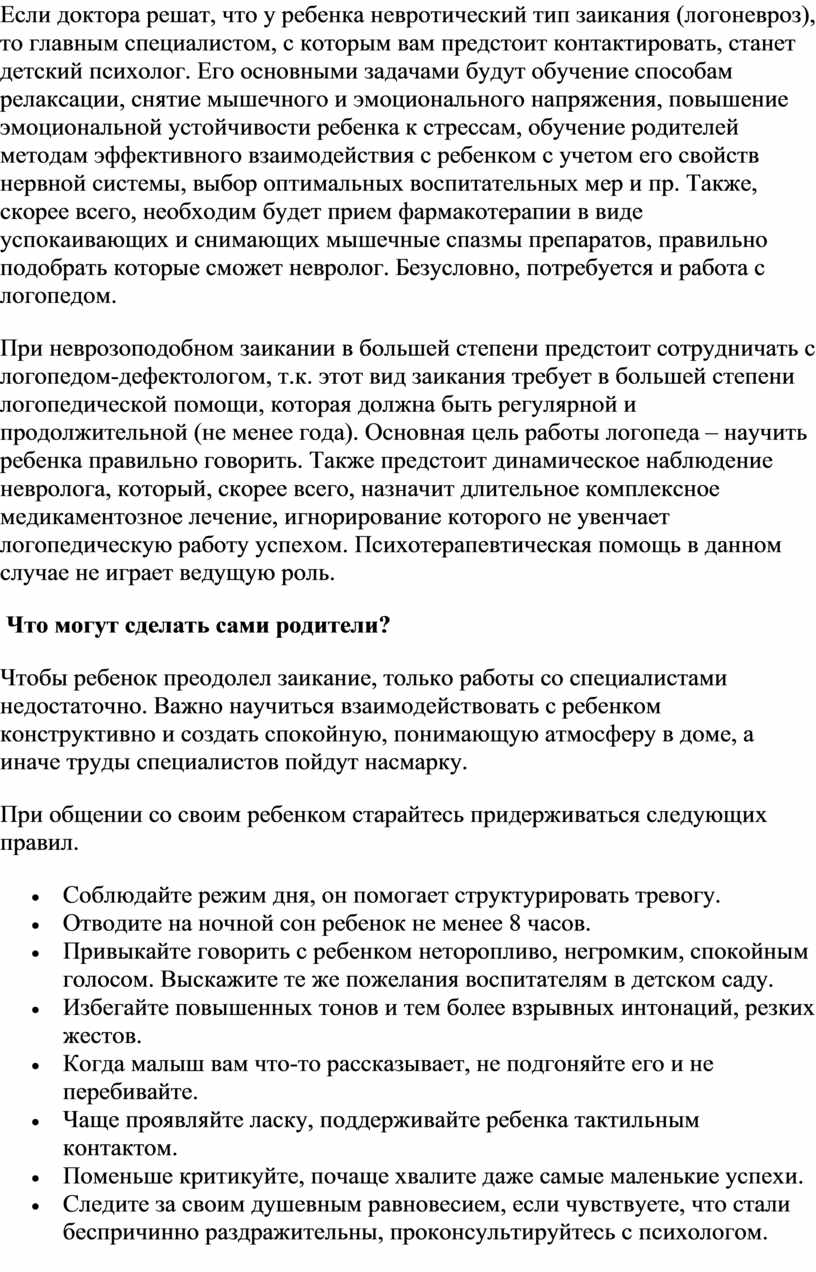 Если доктора решат, что у ребенка невротический тип заикания (логоневроз), то главным специалистом, с которым вам предстоит контактировать, станет детский психолог. Его основными задачами будут обучение способам релаксации, снятие мышечного и эмоционального напряжения, повышение эмоциональной устойчивости ребенка к стрессам, обучение родителей методам эффективного взаимодействия с ребенком с учетом его свойств нервной системы, выбор оптимальных воспитательных мер и пр. Также, скорее всего, необходим будет прием фармакотерапии в виде успокаивающих и снимающих мышечные спазмы препаратов, правильно подобрать которые сможет невролог. Безусловно, потребуется и работа с логопедом.