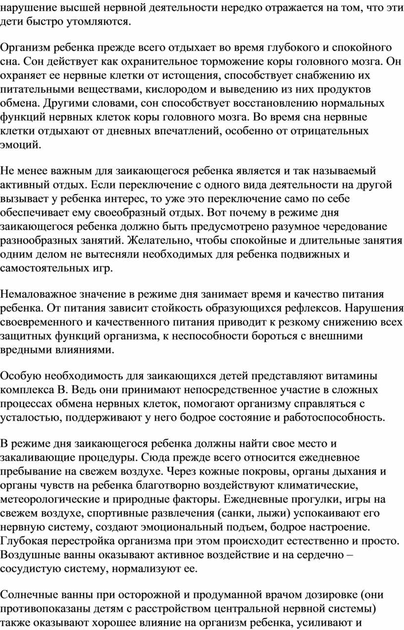 Твердый режим дня – непременное условие для нормализации у заикающегося ребенка высших отделов нервной системы. В частности, нарушение высшей нервной деятельности нередко отражается на том, что эти дети быстро утомляются.