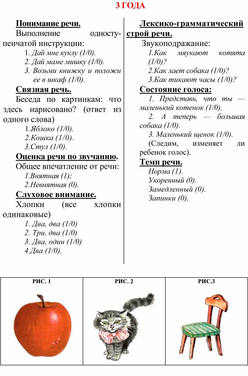 Понимание речи. Выполнение одноступенчатой инструкции: 1. Дай мне куклу (1/0). 2. Дай маме мишку (1/0). 3. Возьми книжку и положи ее в шкаф (1/0). Связная речь. Беседа по картинкам: что здесь нарисовано? (ответ из одного слова) 1.Яблоко (1/0). 2.Кошка (1/0). 3.Стул (1/0). Оценка речи по звучанию. Общее впечатление от речи: 1.Внятная (1); 2.Невнятная (0). Слуховое внимание. Хлопки (все хлопки одинаковые) 1. Два, два (1/0) 2. Три, два (1/0) 3. Два, один (1/0) 4.Два (1/0).