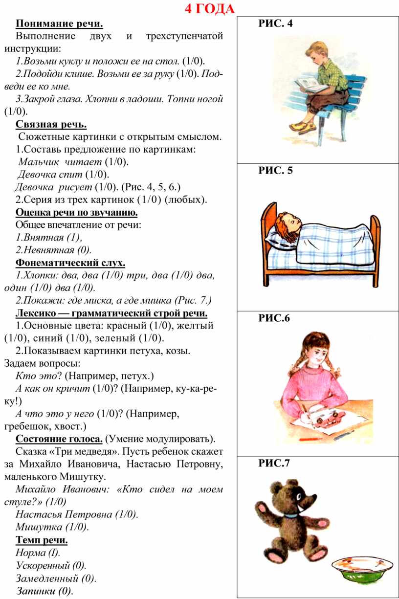 «Понимание речи» включает в себя понимание инструкции, которую необходимо выполнить в определенной последовательности. С возрастом в задания включаются ответы на вопросы, объяснение наиболее часто употребляемых пословиц.
