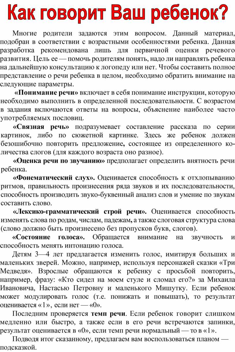 Многие родители задаются этим вопросом. Данный материал, подобран в соответствии с возрастными особенностями ребенка. Данная разработка рекомендована лишь для первичной оценки речевого развития. Цель ее — помочь родителям понять, надо ли направлять ребенка на дальнейшую консультацию к логопеду или нет. Чтобы составить полное представление о речи ребенка в целом, необходимо обратить внимание на следующие параметры.