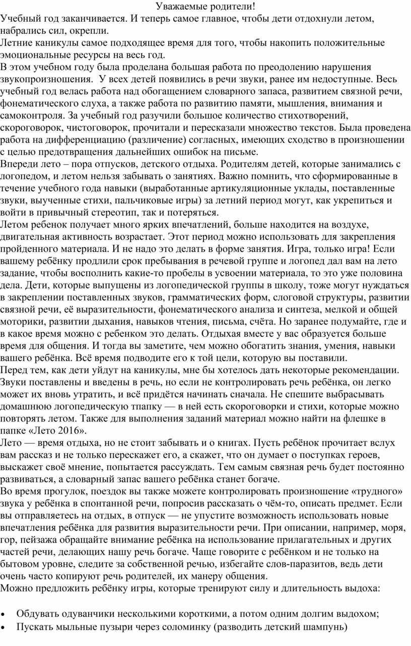 Перед тем, как дети уйдут на каникулы, мне бы хотелось дать некоторые рекомендации. Звуки поставлены и введены в речь, но если не контролировать речь ребёнка, он легко может их вновь утратить, и всё придётся начинать сначала. Не спешите выбрасывать домашнюю логопедическую тпапку — в ней есть скороговорки и стихи, которые можно повторять летом. Также для выполнения заданий материал можно найти на флешке в папке «Лето 2016».