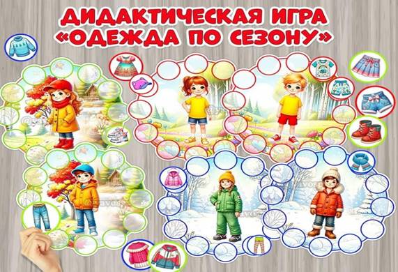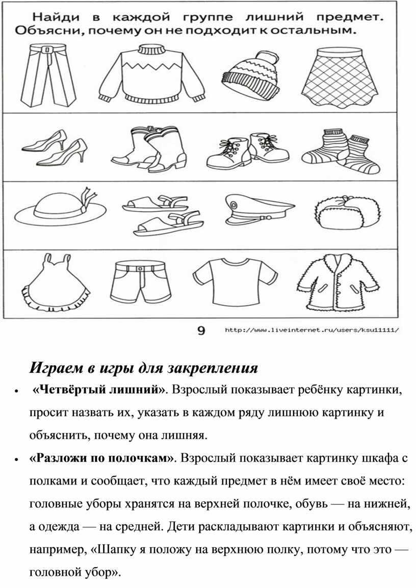 · «Разложи по полочкам». Взрослый показывает картинку шкафа с полками и сообщает, что каждый предмет в нём имеет своё место: головные уборы хранятся на верхней полочке, обувь — на нижней, а одежда — на средней. Дети раскладывают картинки и объясняют, например, «Шапку я положу на верхнюю полку, потому что это — головной убор».
