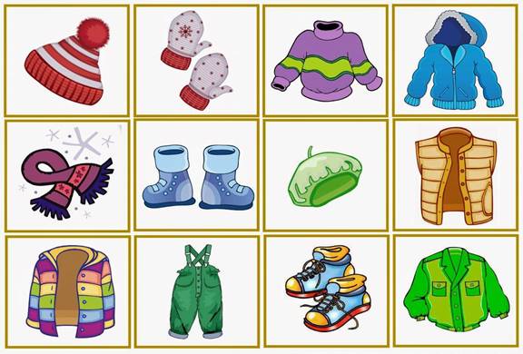 · Дидактические карточки с изображением предметов одежды и обуви. Например, комплект карточек «Одежда и обувь», который включает карточки с изображениями куртки, рубашки, свитера, юбки, штанов, шорт и обуви (туфли, сандалии, сапоги, ботинки, кроссовки, тапочки).