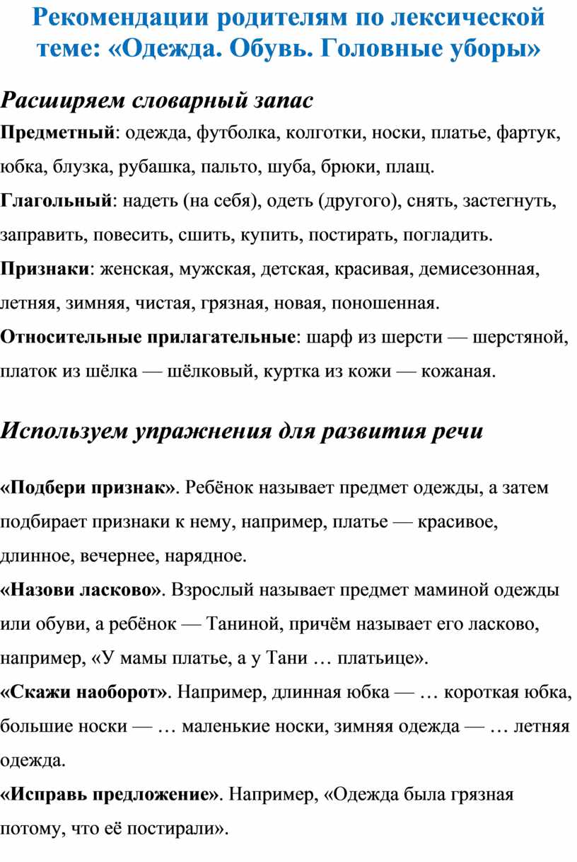 Рекомендации родителям по лексической теме: «Одежда. Обувь. Головные уборы»