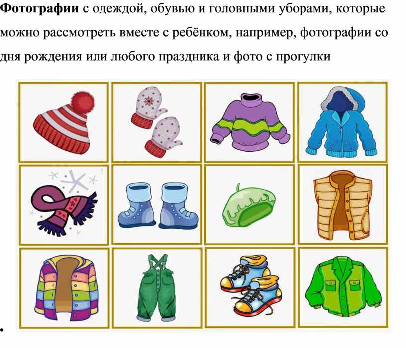 · Фотографии с одеждой, обувью и головными уборами, которые можно рассмотреть вместе с ребёнком, например, фотографии со дня рождения или любого праздника и фото с прогулки