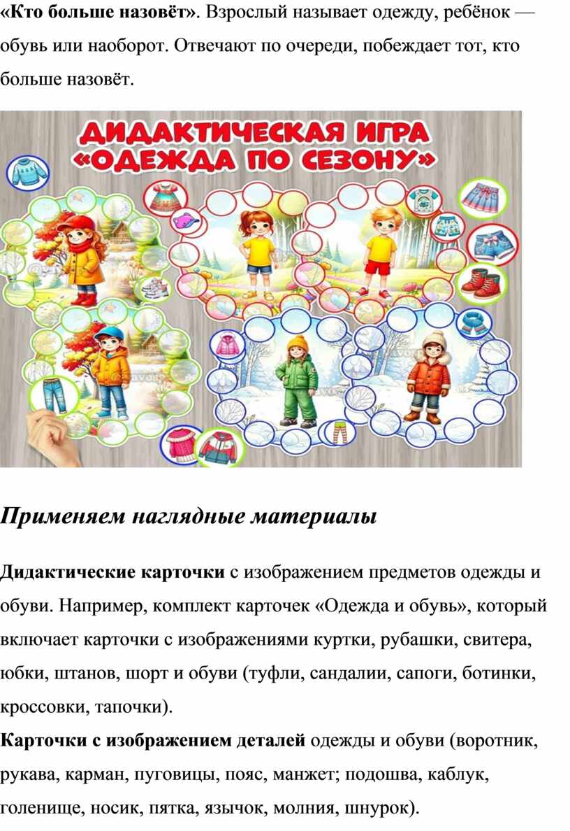 · «Кто больше назовёт». Взрослый называет одежду, ребёнок — обувь или наоборот. Отвечают по очереди, побеждает тот, кто больше назовёт.