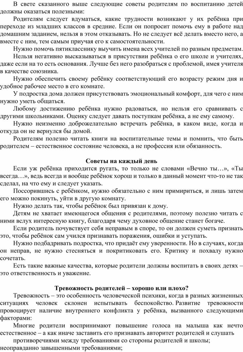 Родителям следует вдуматься, какие трудности возникают у их ребёнка при переходе из младших классов в средние. Если он попросит помочь ему в работе над домашним заданием, нельзя в этом отказывать. Но не следует всё делать вместо него, а вместе с ним, тем самым приучая его к самостоятельности.