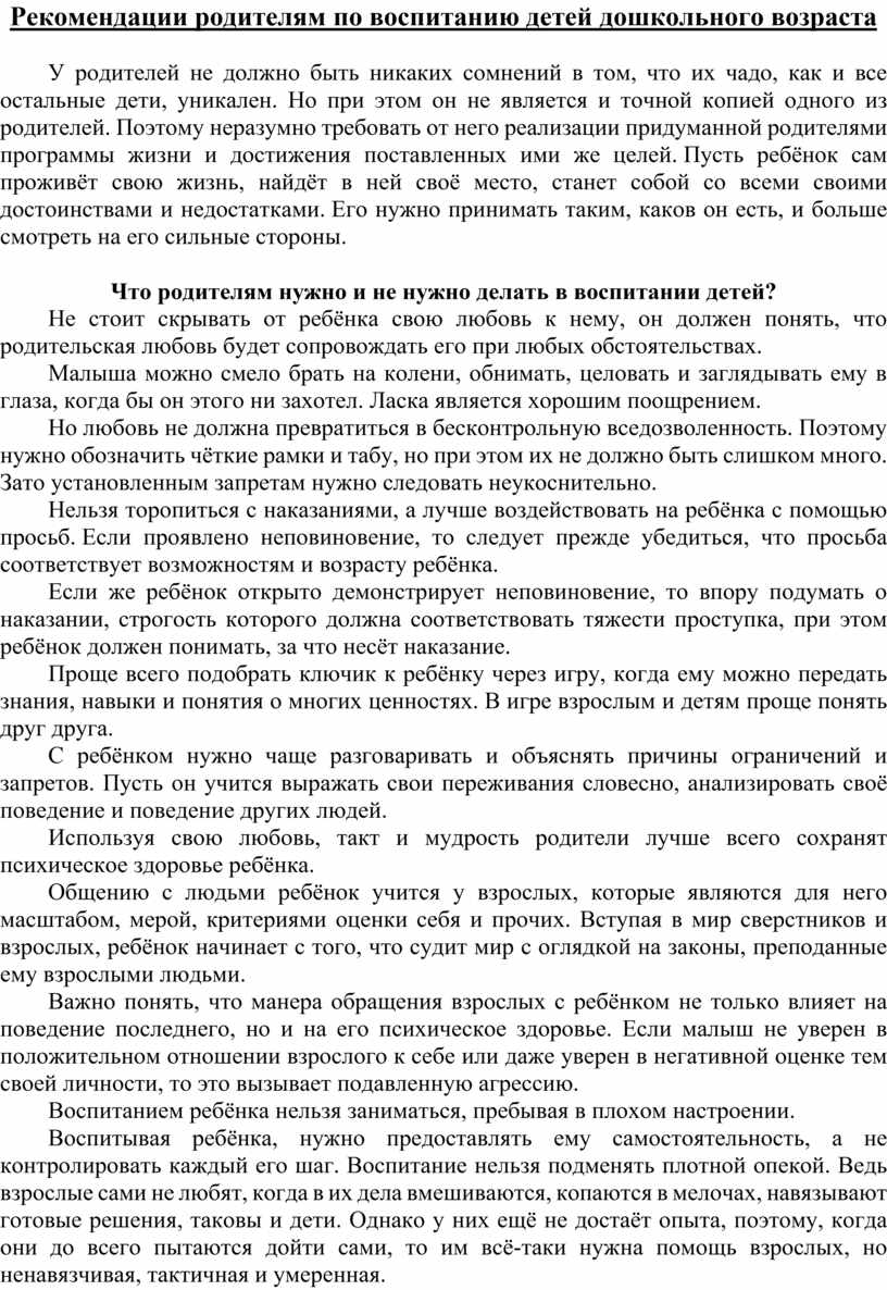 Рекомендации родителям по воспитанию детей дошкольного возраста