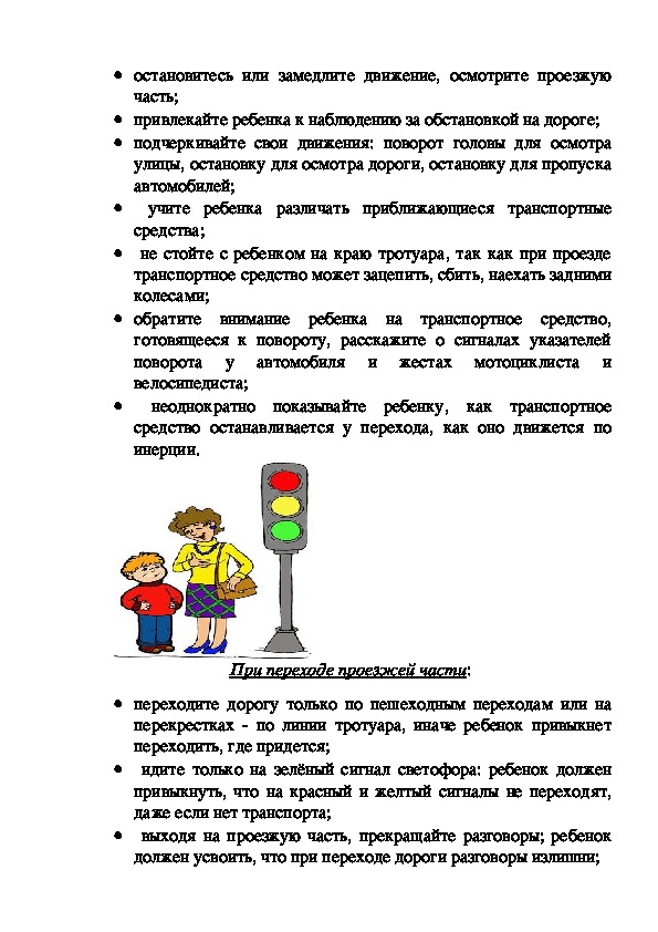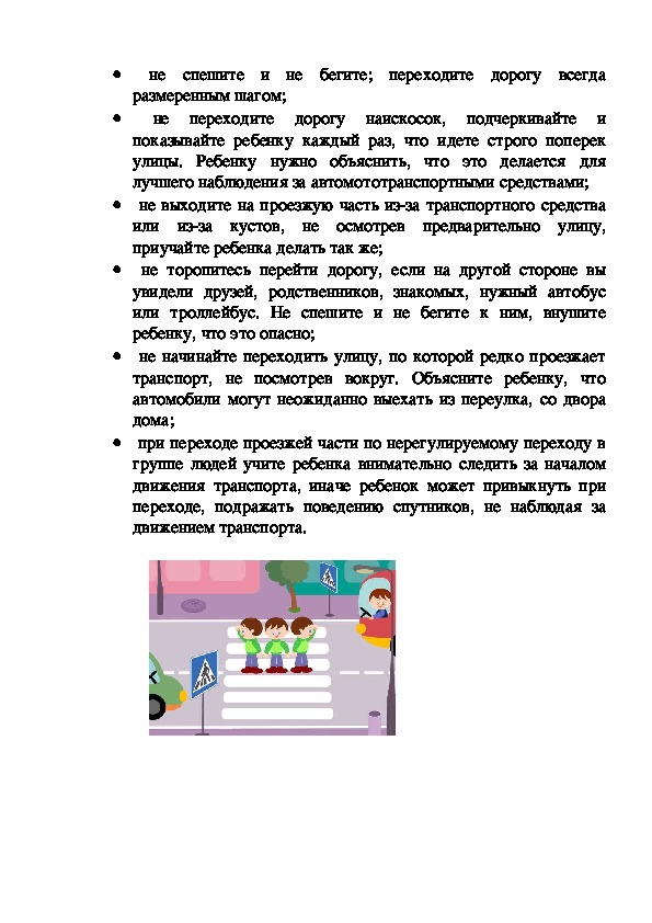 должен усвоить, что при переходе дороги разговоры излишни; не спешите и не бегите; переходите дорогу всегда