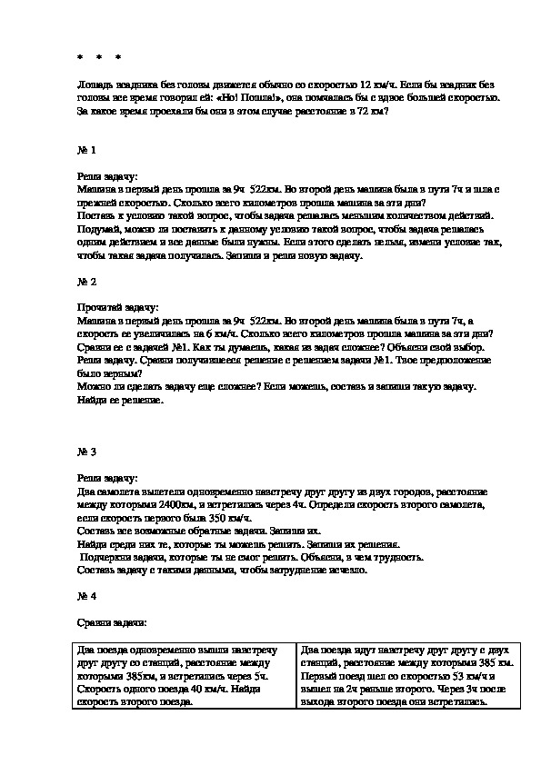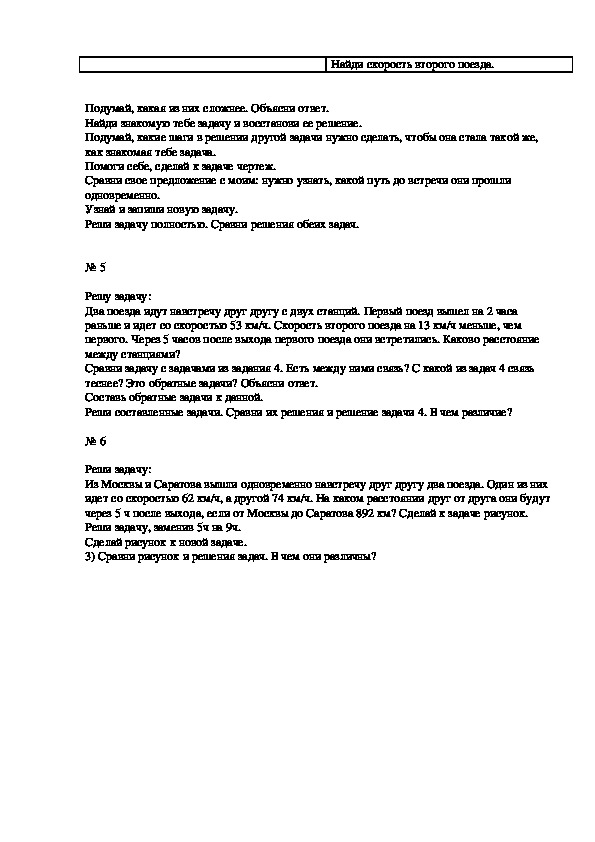 После ознакомления со скоростью движения и изучения связи между величинами, скорость, время, расстояние , необходимо сформировать у детей умения и навыки решения задач на встречное движение различных видов, а также умение решать и составлять задачи по чертежам и таблицам. Ученики должны научиться сравнивать задачи и выявлять сходное и различное, составлять задачи по выражениям.
