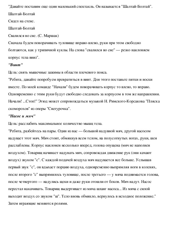 Цель: расслабить мышцы рук, спины и груди."Давайте поставим еще один маленький спектакль. Он называется "ШалтайБолтай".