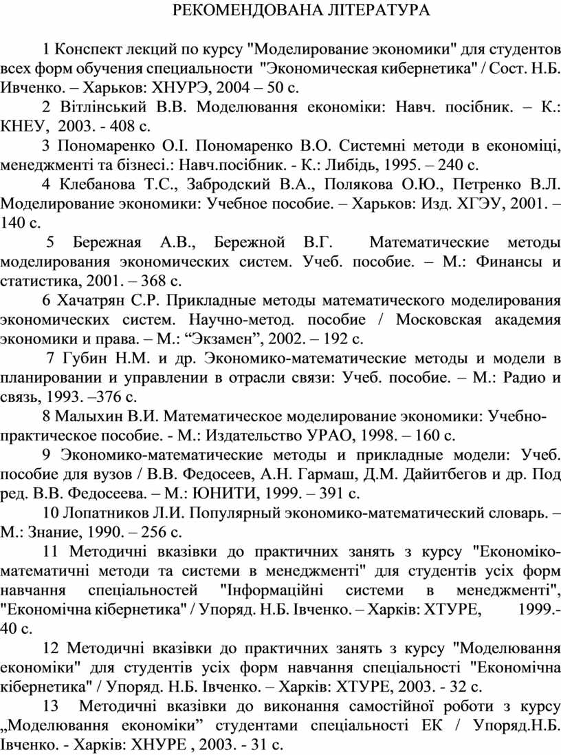 13 Методичні вказівки до виконання самостійної роботи з курсу „Моделювання економіки” студентами спеціальності ЕК / Упоряд.Н.Б. Івченко. - Харків: ХНУРЕ , 2003. - 31 с.