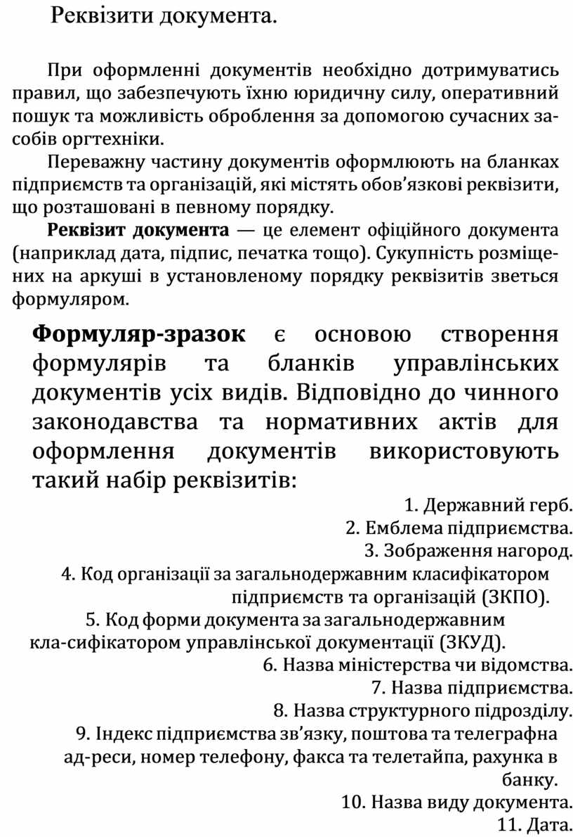 Формуляр-зразок є основою створення формулярiв та бланкiв управлiнських документiв усiх видiв. Вiдповiдно до чинного законодавства та нормативних актiв для оформлення документiв використовують такий набiр реквiзитiв: