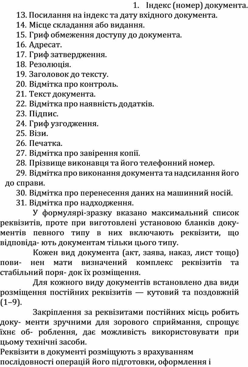 Кожен вид документа (акт, заява, наказ, лист тощо) пови- нен мати визначений комплекс реквізитів та стабільний поря- док їх розміщення.