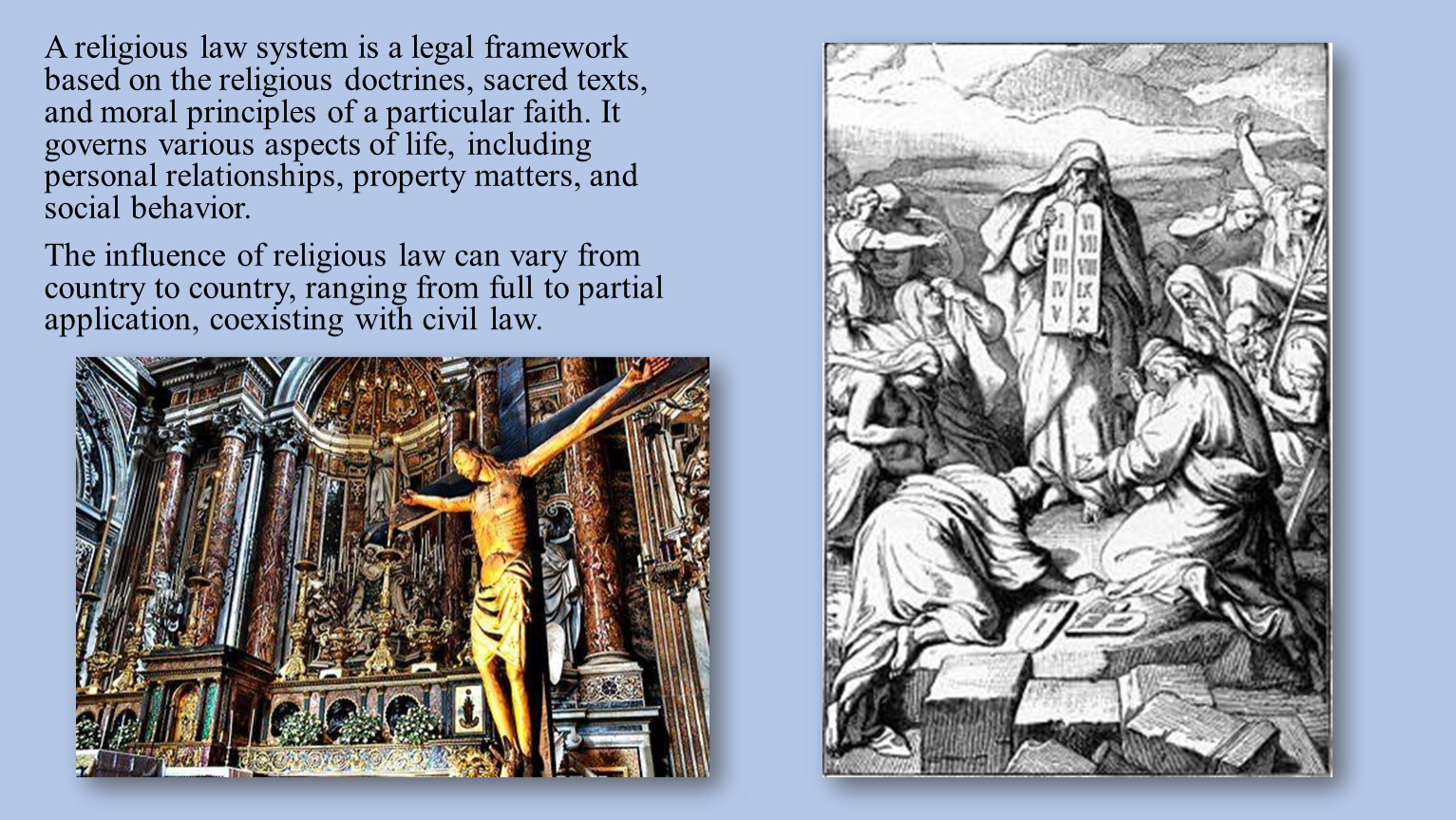 The influence of religious law can vary from country to country, ranging from full to partial application, coexisting with civil law.