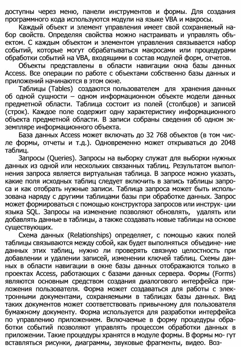 База данных Access может включать до 32 768 объектов (в том чис- ле формы, отчеты и т.д.). Одновременно может открываться до 2048 таблиц.