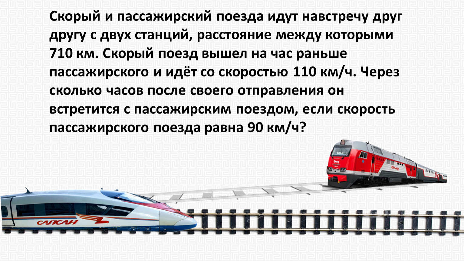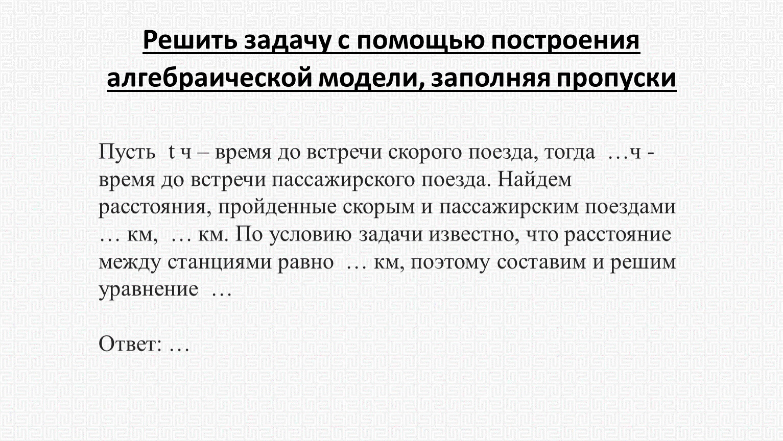 Пусть t ч – время до встречи скорого поезда, тогда …ч - время до встречи пассажирского поезда. Найдем расстояния, пройденные скорым и пассажирским поездами … км, … км. По условию задачи известно, что расстояние между станциями равно … км, поэтому составим и решим уравнение …