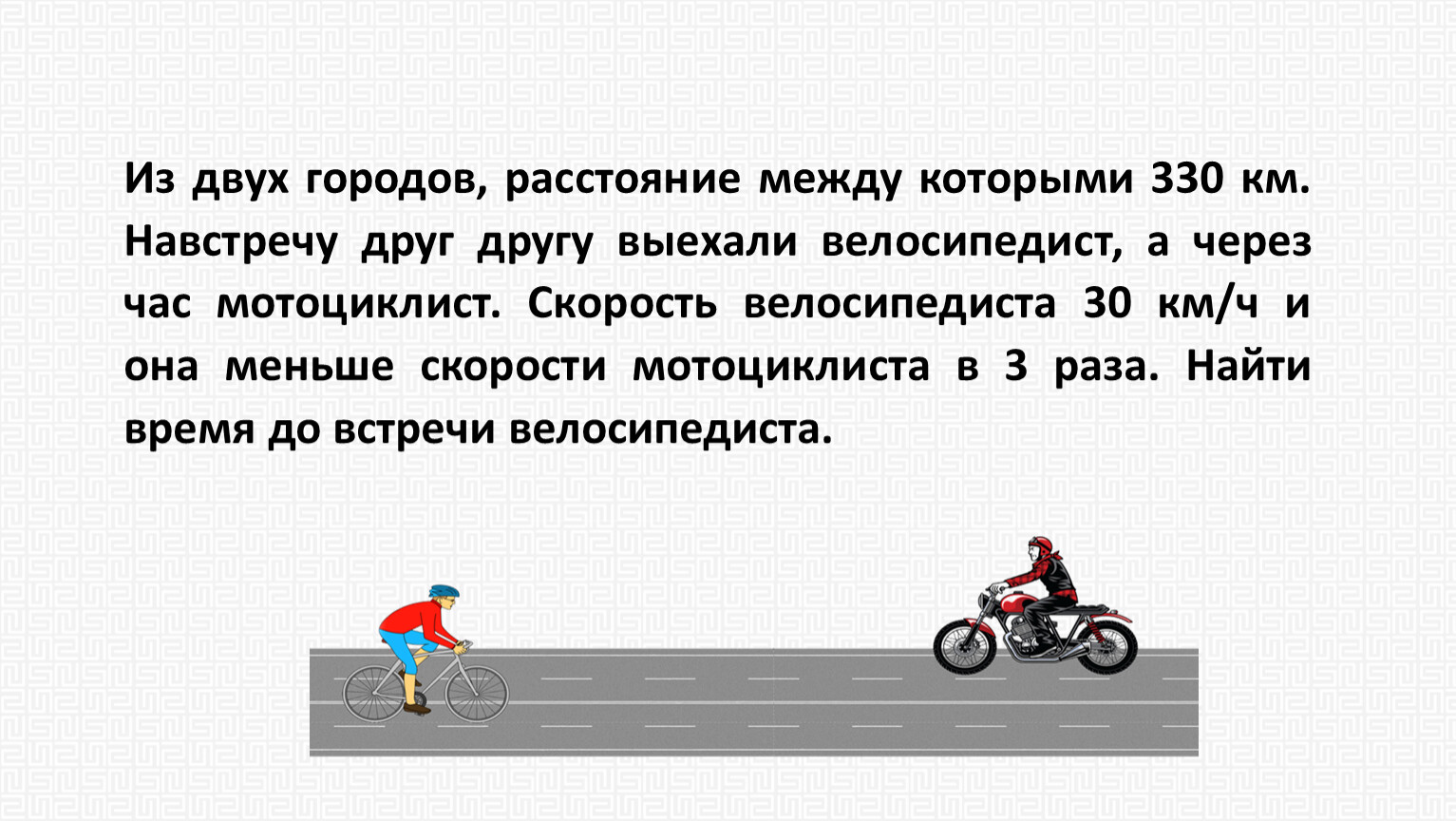 Из двух городов, расстояние между которыми 330 км. Навстречу друг другу выехали велосипедист, а через час мотоциклист. Скорость велосипедиста 30 км/ч и она меньше скорости мотоциклиста в 3 раза. Найти время до встречи велосипедиста.