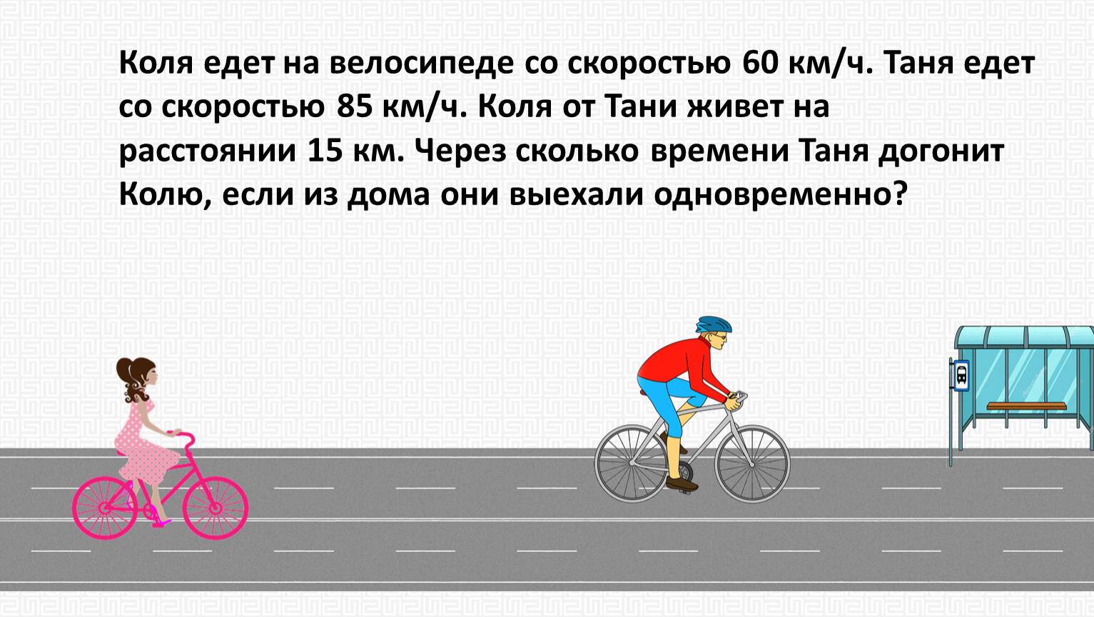 Коля едет на велосипеде со скоростью 60 км/ч. Таня едет со скоростью 85 км/ч. Коля от Тани живет на расстоянии 15 км. Через сколько времени Таня догонит Колю, если из дома они выехали одновременно?