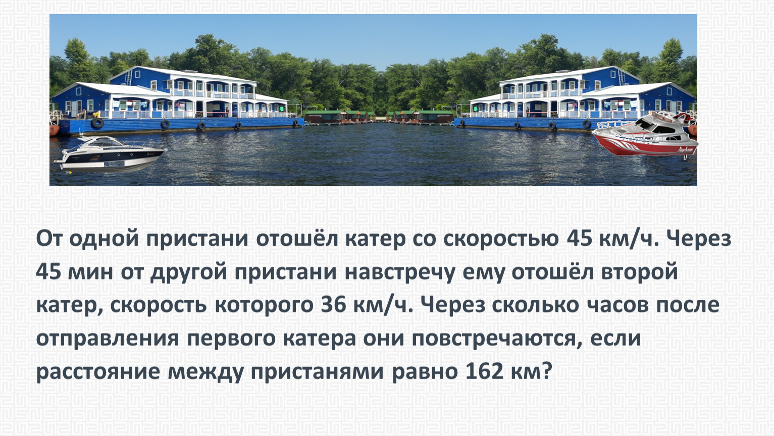 От одной пристани отошёл катер со скоростью 45 км/ч. Через 45 мин от другой пристани навстречу ему отошёл второй катер, скорость которого 36 км/ч. Через сколько часов после отправления первого катера они повстречаются, если расстояние между пристанями равно 162 км?