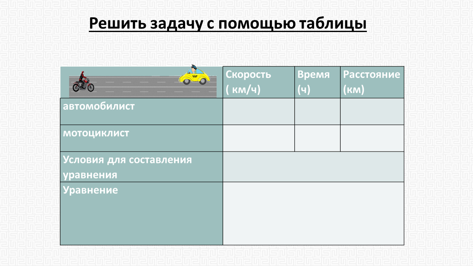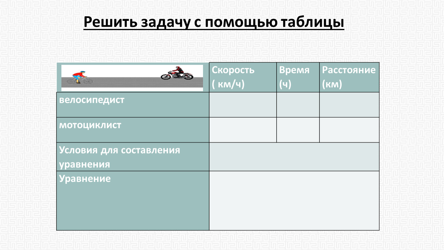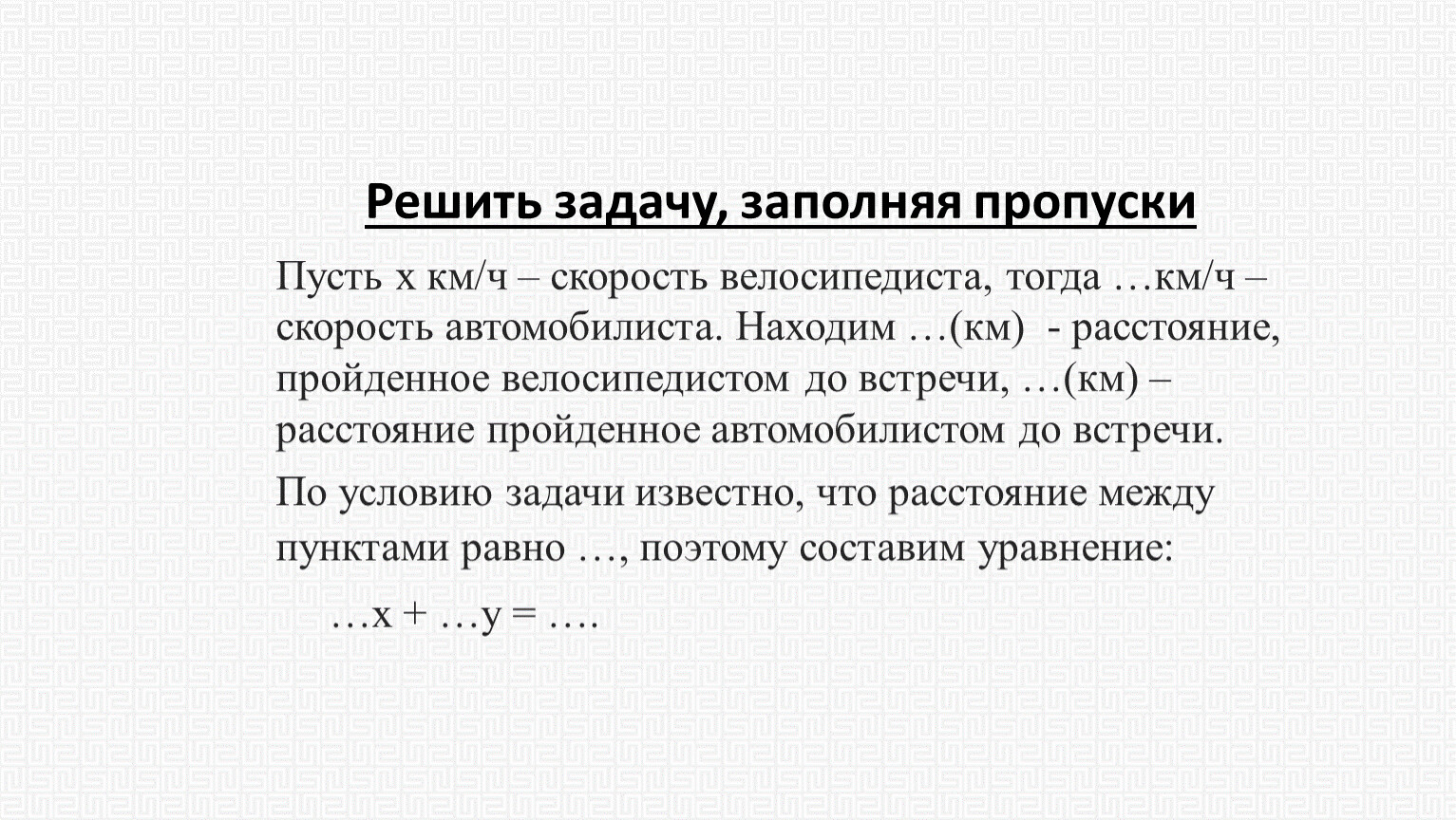Пусть х км/ч – скорость велосипедиста, тогда …км/ч – скорость автомобилиста. Находим …(км) - расстояние, пройденное велосипедистом до встречи, …(км) – расстояние пройденное автомобилистом до встречи.