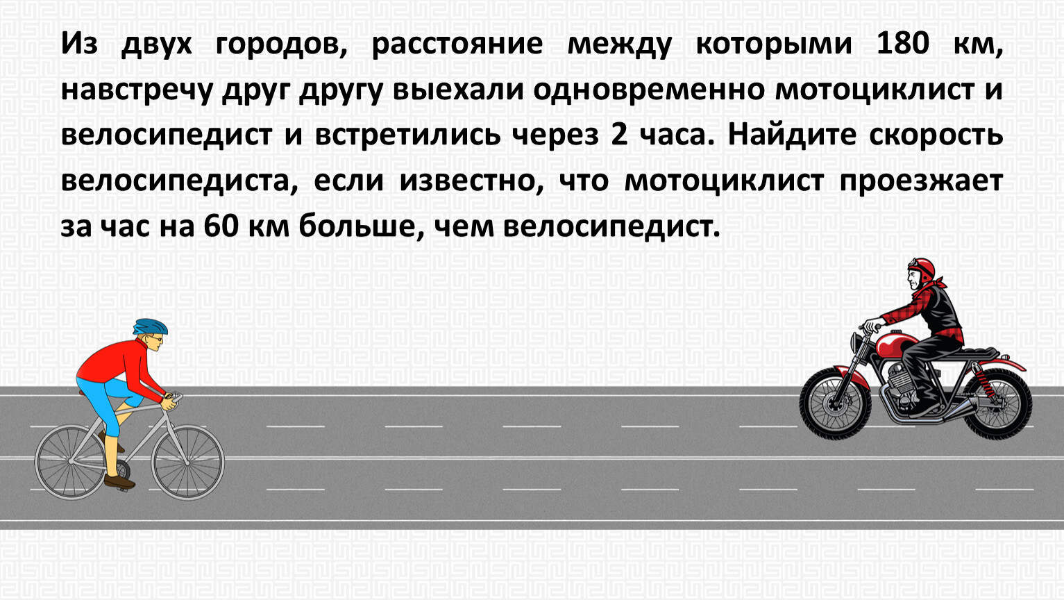 Из двух городов, расстояние между которыми 180 км, навстречу друг другу выехали одновременно мотоциклист и велосипедист и встретились через 2 часа. Найдите скорость велосипедиста, если известно, что мотоциклист проезжает за час на 60 км больше, чем велосипедист.